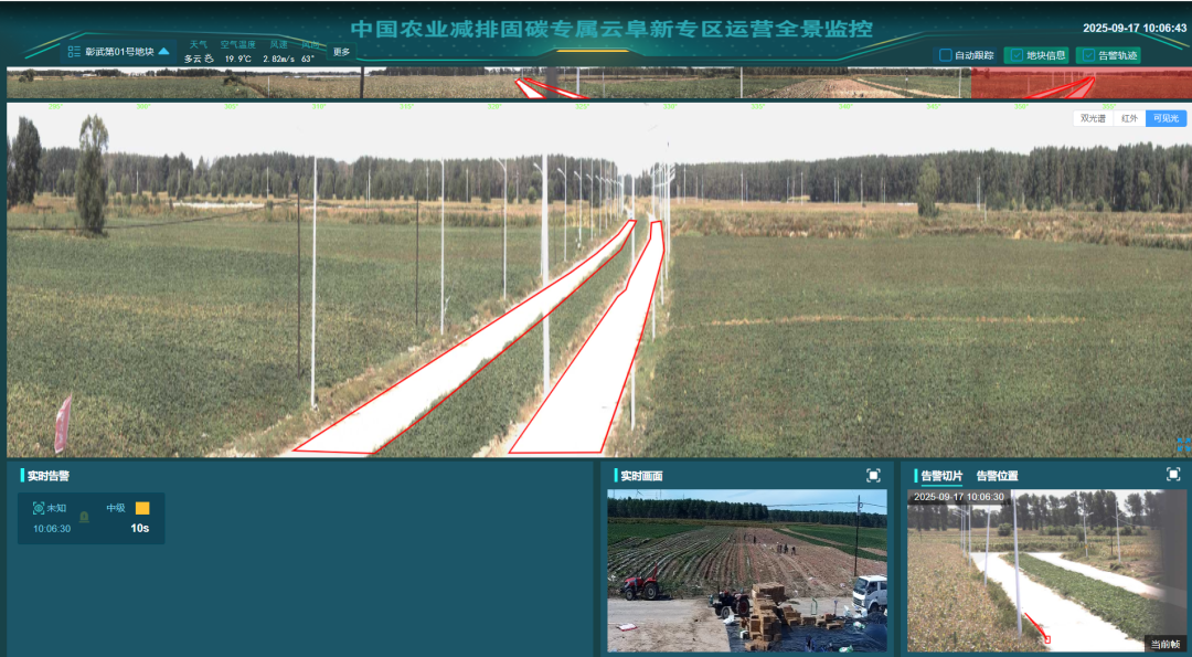 在零碳农业领域,研发团队对系统进行了针对性的升级调整。其一,节能方面,全景光电设备可采用太阳能等清洁能源,降低能耗,减少碳排放;其二,融合层面,设备能将全景图、预警数据,以及收集到的气温、土壤等数据提供给零碳农业管理平台,为零碳农业生产提供数据支撑;其三,共享维度,未来今年会设备会把收集的所有数据同步传输给阜新市大数据局,为整个阜新市的农业决策提供数据支持。